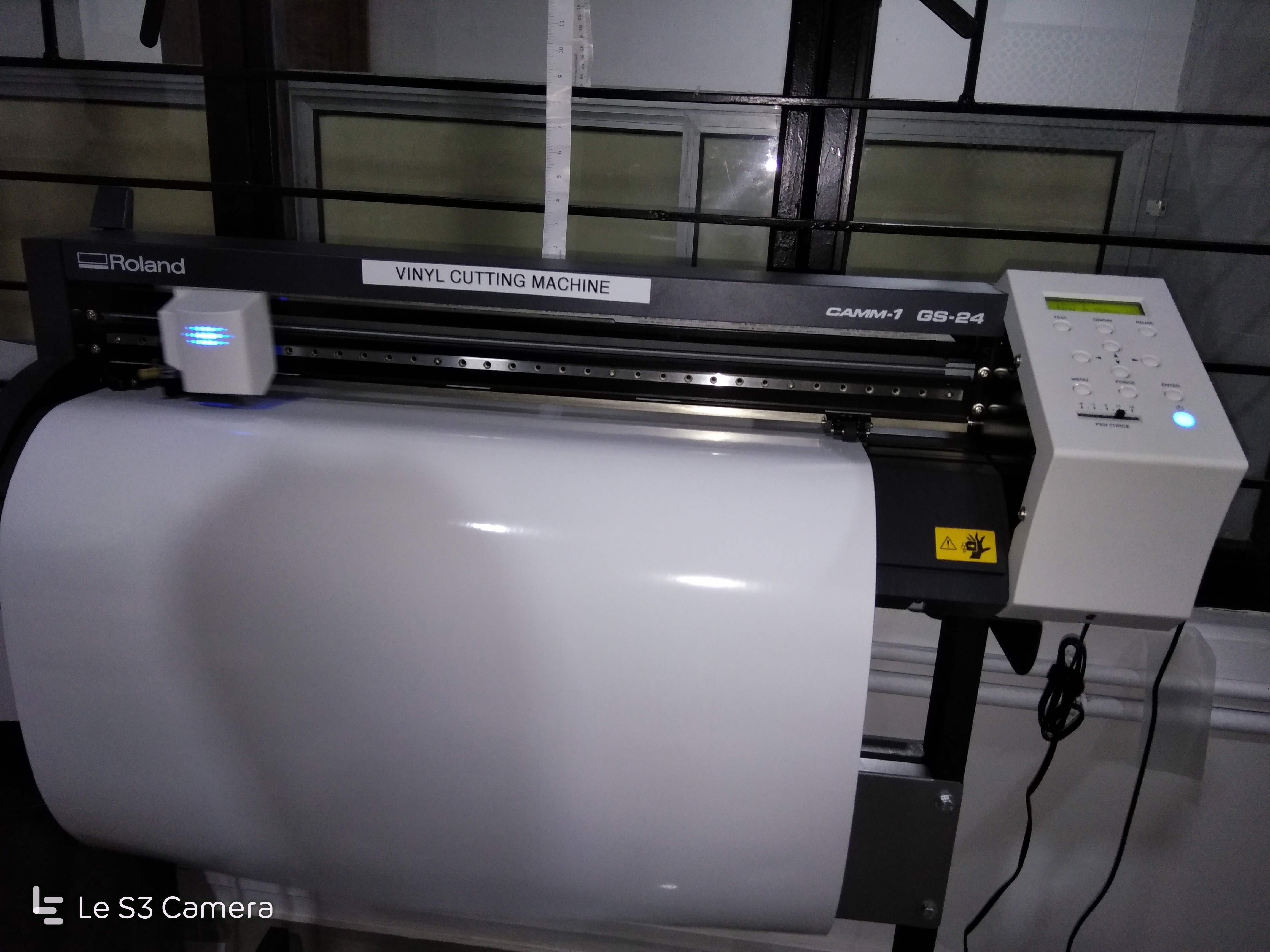 A vinyl cutter is a type of computer-controlled machine. Small vinyl cutters look like computer printers. The computer controls the movement of a sharp blade. This blade is used to cut out shapes and letters from sheets of thin self-adhesive plastic (vinyl).